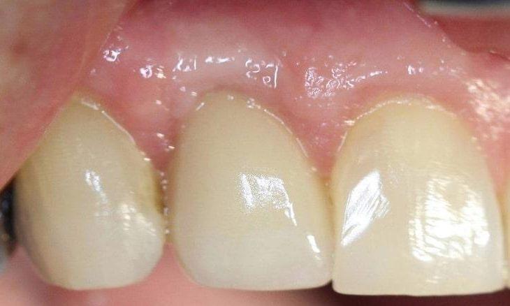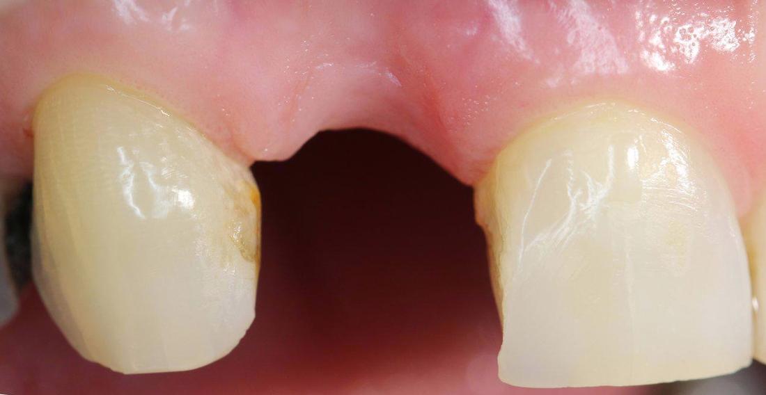The before picture shows a lateral and chipped central incisor. The after picture shows a lateral incisor replaced by an implant-supported all-ceramic crown and composite resin on the central incisor.
